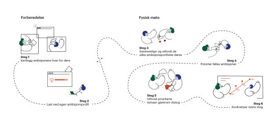 Verktøyet guider dere gjennom en prosess med forberedelser (ca. 30 min) og et fysisk møte (ca. 90 min).